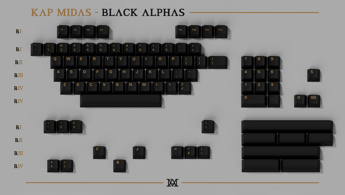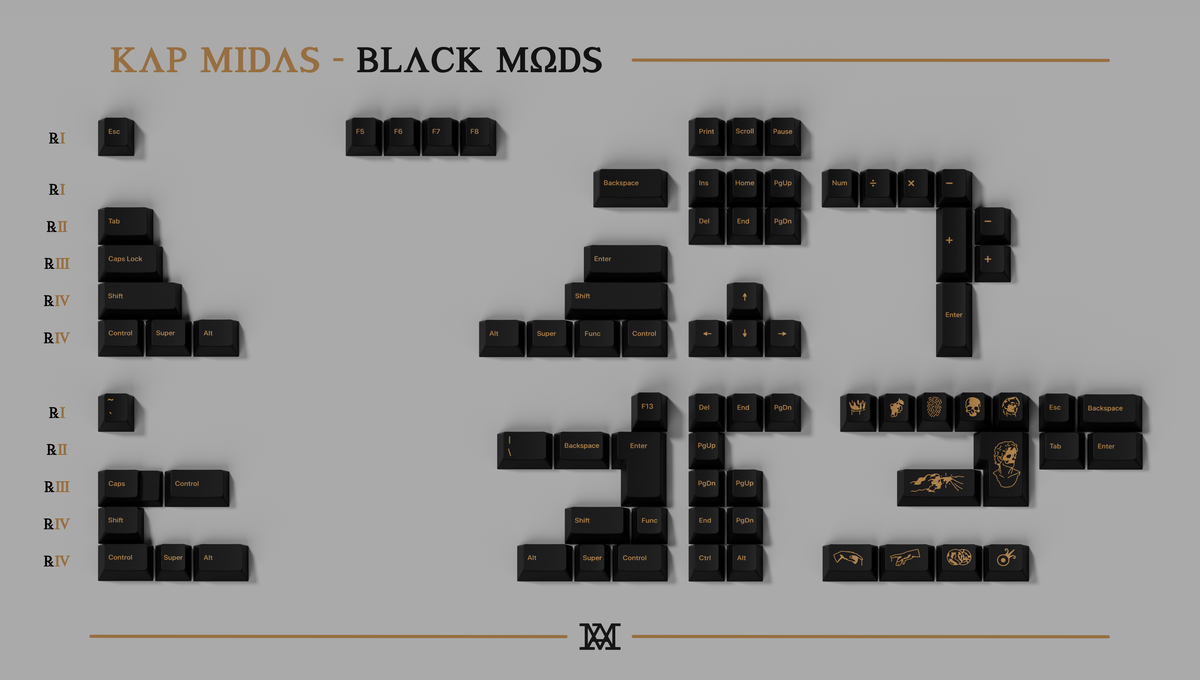 Unit price perIntroducing KAP Midas, a doubleshot PBT keycap set produced by Keyreative and designed by ManuKbs. KAP Midas features metallic gold effect legends on either light or dark base options with novelties included.
